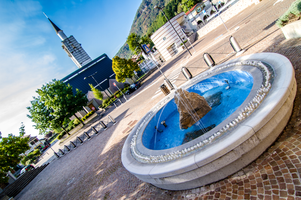 Realizzazione della copertina in Pietra Piasentina bocciardata a mano della fontana ubicata in piazza Urli a Magnano in Riviera, caratterizzata anche da un blocchetto grezzo centrale sempre in Pietra Piasentina da cui sgorga l'acqua.